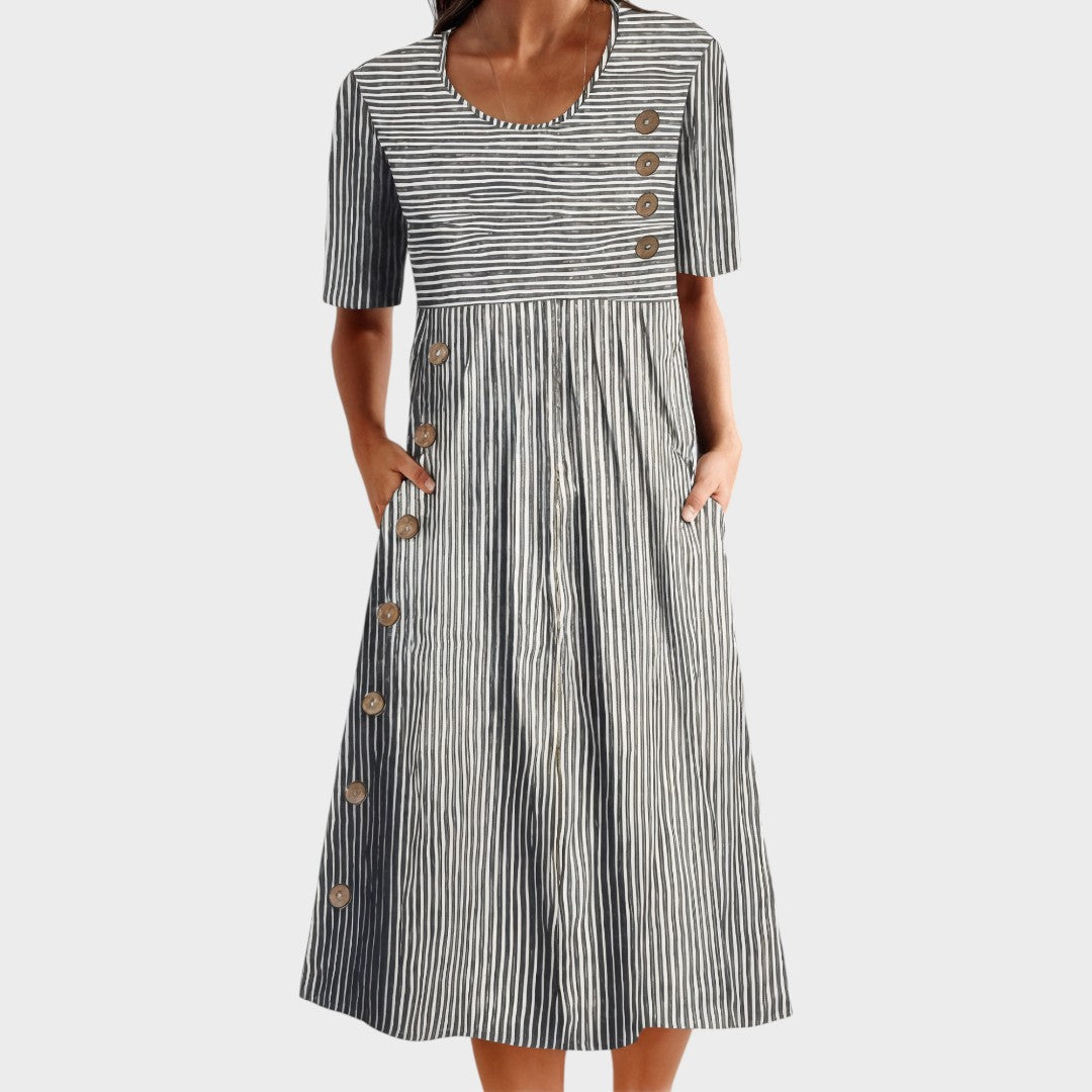Praktičnost i stil u jednom – s bočnim džepovima i ugodnim dizajnom, haljina spaja funkcionalnost i sofisticiran izgled.