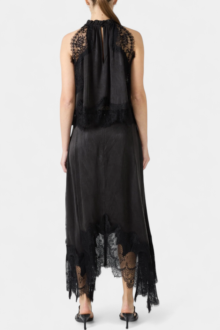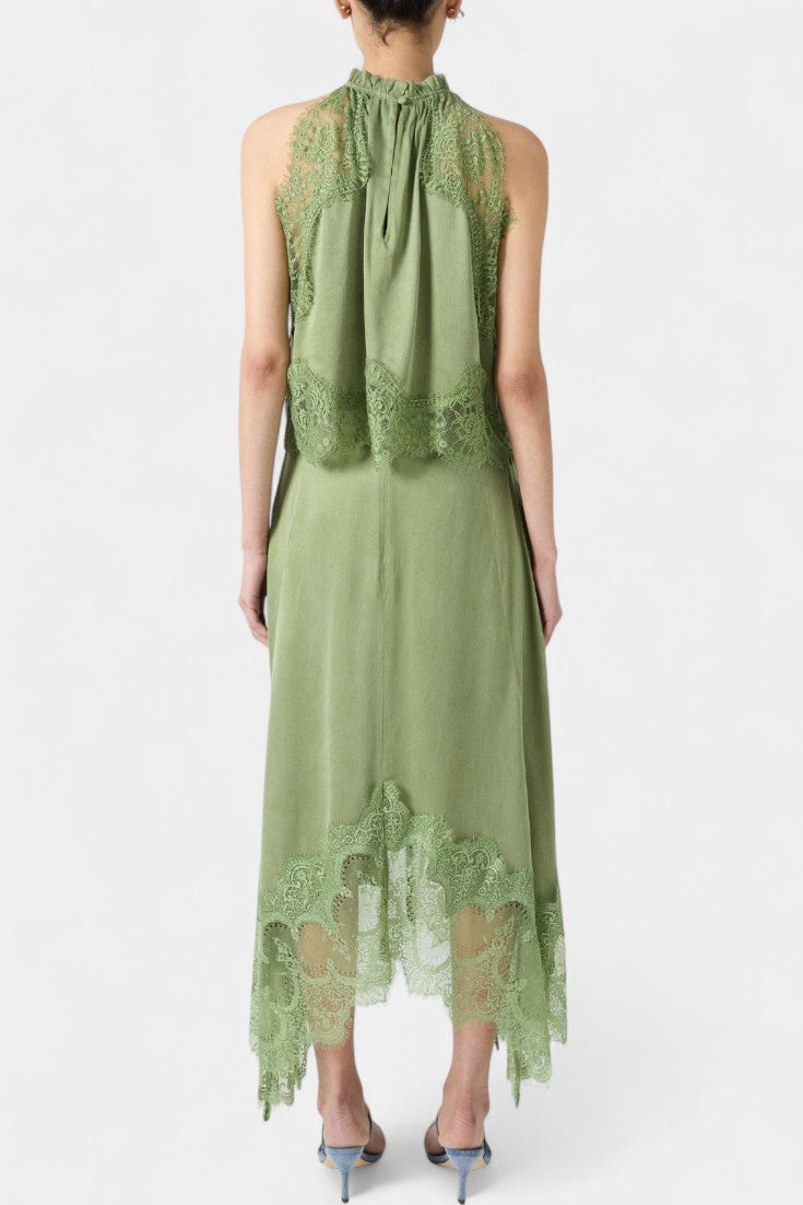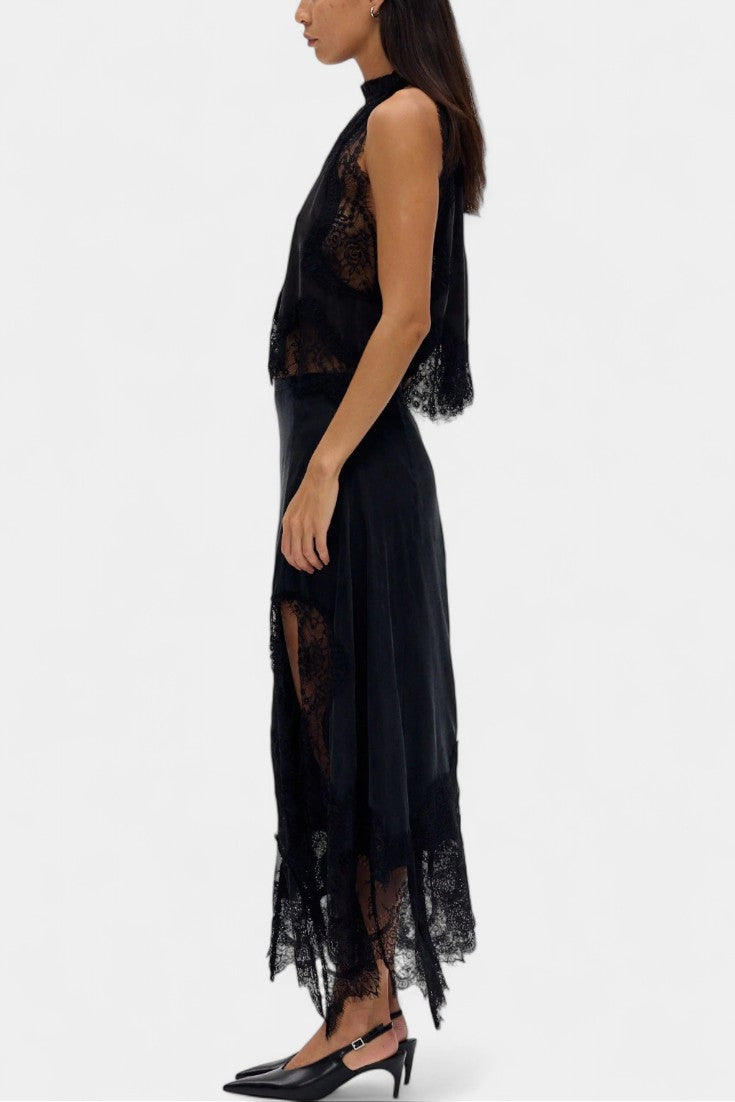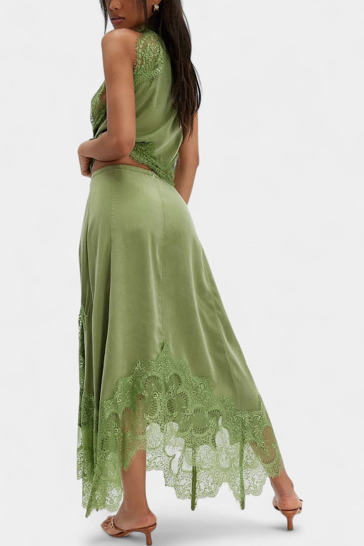 Set koji zrači pokretom, svježinom i bezvremenskom sofisticiranošću. Nada kombinira midi suknju s delikatnim čipkastim panelima i asimetričnom porubom koja donosi fluidnost u svaki korak, uz usklađeni top koji uravnotežuje eleganciju i modernost.